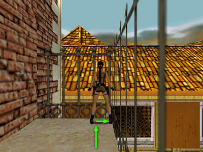 This variation on the fence bug was found by Joe C. and reported on tombraiders.com. It works in Tomb Raiders 1-3 in most locations where there is a concave corner in a fence or balcony (i.e., a thin texture with regular seams and open space on the other side).