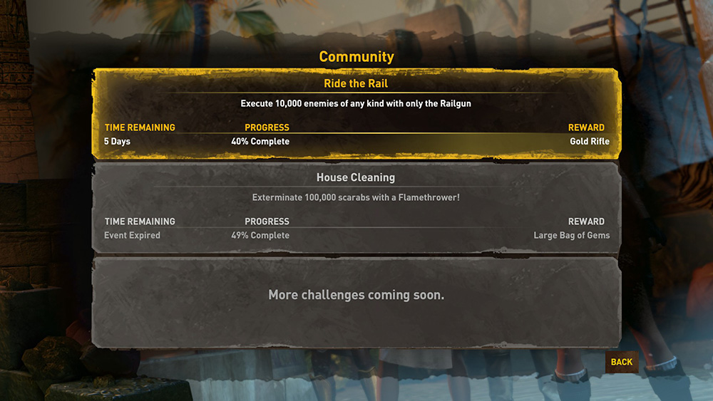 Aside from the various challenges incorporated into each level of the game, Lara Croft and the Temple of Osiris also includes special Community Challenges and Combat Challenges.