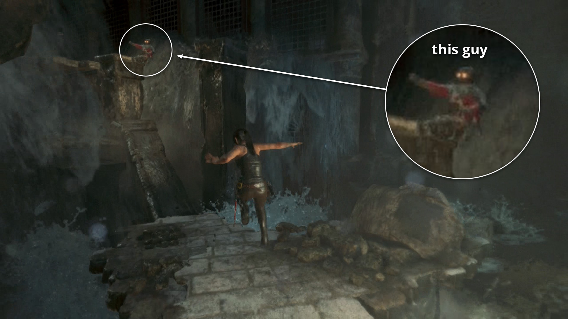 After Lara's confrontation with the Trinity soldiers, there are still 2 bad guys left behind. Quickly shoot them from the partial cover of the tomb. If you can steady your aim enough for a headshot, you'll receive bonus XP, but don't worry too much about this. Just kill both of them...