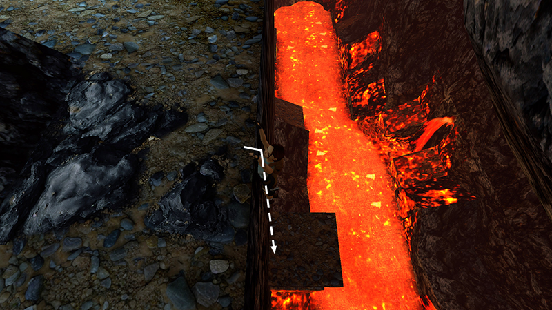 NOTE: In the remastered game, I experienced a recurring glitch with this jump. Using the normal setup with tank controls—walk to the edge, hop back, then run and jump—Lara would consistently stop at the edge of the angled block and take a standing jump into the lava. Instead, walk to the edge, hop back, then walk one step backward. It's more like half a step, since there isn't a lot of room to maneuver, but if you do this, then take the running jump, Lara should behave.