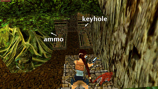 When you've killed the second tiger walk through the "wall" of leaves where the first tiger emerged into the hidden area beyond. (screenshot) While grooving to the awesome soundtrack, take a standing jump to the top of the block in the left corner and pick up some shotgun shells (14). Return through the greenery, turn right, and follow the path around the corner to a large open area under a leafy canopy.