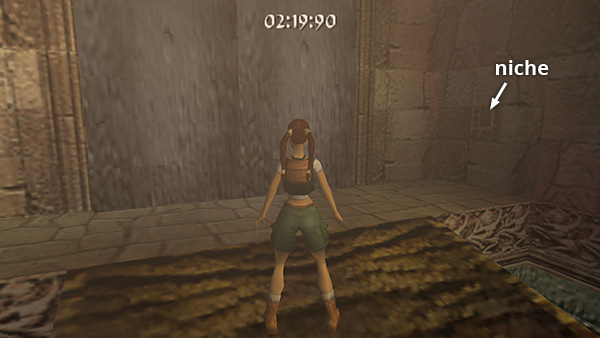 If Von Croy reaches this door before you, he'll pass through and it will begin to close behind him. (screenshot) Either dive through before it closes all the way, or to re-open it, step up to the small, rectangular niche on the wall to the right of the door and press Action. Lara will reach in and operate a mechanism to open the door. (screenshot) This is new to TR4, and you'll be doing it frequently in later levels.