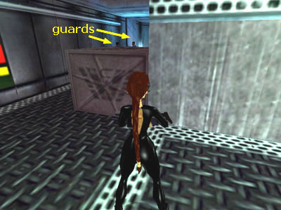 Go back into the hallway but don't turn the corner, since the gun turret on the ceiling is now functional. Wait for the 2 guards (11-12) to come to you. Then kill them. Sprint past the gun turret, taking a little damage in the process. Continue to the end of the hall. When the guards came in, they opened a panel on the left. Follow this hallway, killing 2 more guards (13-14) on the way down.