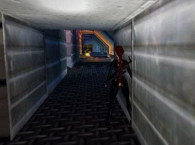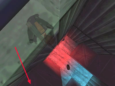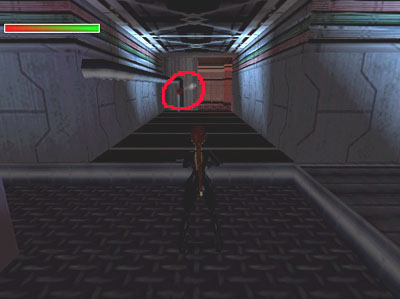 TRAPPING THE CYBORG: Because you pressed the button in the bar, the doorway straight ahead (leading to the FOUR-WAY INTERSECTION) is once again blocked by lasers. So run through the doorway on the right, up the ramp and down the other side. Sprint along this straightaway if possible. You'll pass over a grate with a small room below containing a switch. Continue through a room with a window on the right, exiting through the door on the left. Turn left at the next corner, then left a third time down a ramp to the small room with the switch. If you've done everything right, you should be able to look up through the grate and see the cyborg entering the room above. Use the switch to trap him there. This run (from the bar, past the helicopter, and down to the switch) is indicated by dark blue arrows in the map above. The room where the cyborg is trapped is marked with a black X.