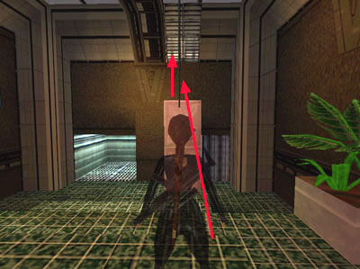 At this point, there will be lasers blocking the door between this room and the FOUR-WAY INTERSECTION. So exit through the hallway that passes over the grate above the switch (following the path marked in yellow in the map). Run up the ramp and down the other side. Then quickly run to the right to avoid the helicopter. Turn right before the crawlspace and you're back on the other side of the FOUR-WAY INTERSECTION. Go into the passageway on the left (the one with no sign). Continue to the low ledge, climb up, turn around and jump to grab the ladder leading up the shaft. Climb into the duct above. The trapdoor should be open. Follow the duct back to the LOBBY. (If the angled metal doors are closed, try dropping through them.)