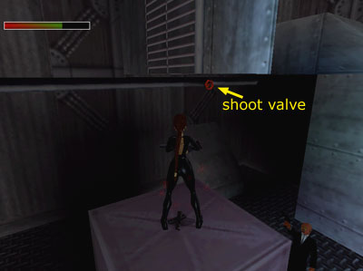 BUG NOTE: This next section also has a potentially serious bug. Do not save your game between sliding down the chute from the LOBBY and destroying the first cyborg. And be sure to destroy the cyborg using the method that involves shooting the valve, described below. Otherwise, you may be unable to complete the level. If you do choose to save, use a new slot in case you activate the bug and need to reload your previous save. If you're already stuck with the bug, see the FIRST POSSIBLE BUG FIX, at the end of this document.