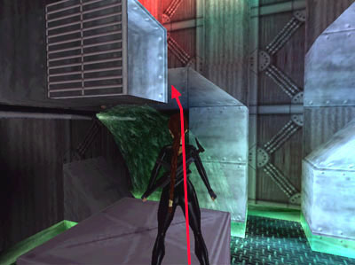 Pick up the grappling gun ammo (15) at the back of the black grate. Equip the GRAPPLING GUN and shoot a hook into the grate on the ceiling. (Again, the light in the scope will turn green when you sight the right spot.) Climb on top of the duct, walk to the front edge, then hop back once. Take a standing jump to grab the rope. Swing into the open grate at the top of the room. Go to the back of the alcove and use the switch to drain the room below.