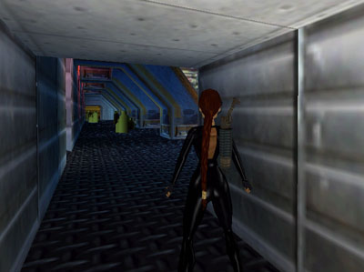 BACK AT THE HALLWAY NEAR THE LASERS: There's another soldier (9) lurking ahead on the right, near the crates. If you set the HK set on sniper mode and walk carefully along the left wall, checking your scope every few steps, you can kill him with a well-aimed headshot before he notices Lara.