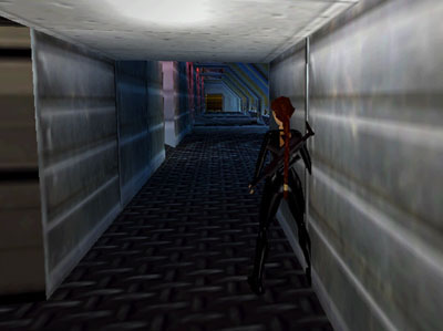Back at the FOUR-WAY INTERSECTION, enter the passageway on the left (the one with no sign). It should be OK to save here before climbing onto the ledge, but don't save again until you have trapped the cyborg. Climb onto the low ledge, turn around and jump back down. This should reset the area. Exit the FOUR-WAY INTERSECTION through the doorway on the right (with the yellow "H" sign). Then turn left. The yellow tanks at the far end of the hallway should have reappeared. Use the HK set on sniper mode to blow them up. This should also get the cyborg moving again, so immediately sprint up the hallway to the left. Run through the room with the window, out the door on the left, left again at the corner and then left once more down the ramp to the switch. (This path is indicated by dark blue arrows on the map.) If the bug fix worked and you ran fast enough, you'll be able to look up through the grate and see the cyborg entering the room above. Use the switch to trap him.
