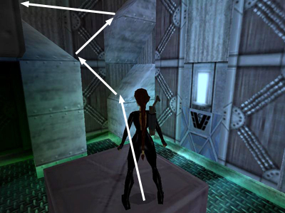 Alternatively, you can do a more complicated series of jumps off the angled steel ducts along the side wall: Position Lara on top of the crate facing the outer corner of the lowest duct, which is on the right. (This screenshot shows her ready to go.) Take a running jump from the crate. Release the Jump button just briefly while Lara is in the air and the press and continue to hold it during the rest of the sequence. If you've set up the jump correctly, Lara will land on the sloping top of the first duct, backflip off it and land on the second duct, jump forward onto the third, then backflip once more to land on the flat top of the second duct.