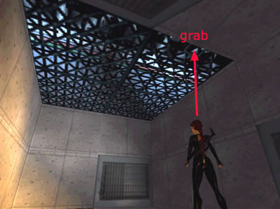 ROOM BELOW GRATE: Press Action to kick open the cracked wall. Crawl through to a small room with a grate in the ceiling. The badly placed fixed camera complicates things, so stay in the crawlspace for a minute and use your ears. You'll hear a soldier (2) patrolling above. When he moves off, go to the right side of the room so Lara isn't directly under the grate. Notice the one section of grate with a handle. This is a trapdoor. Watch until the soldier moves away again. Then stand under the trapdoor, jump up and grab the handle. (See this screenshot if you're not sure where to grab.) Move back to the side again and wait for the soldier to return. Unless Lara is standing right under the grate, he won't notice her. You'll still need to use the HK's burst mode to shoot him, since the fixed camera prevents you from using the scope. (Use auto-aim and wait until Lara raises the rifle before shooting.) Climb out through the trapdoor and go toward the crates.
