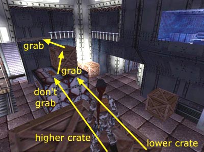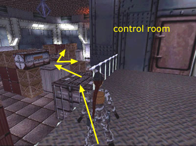 Take a running jump from the balcony to the stacked boxes below the control room on the right. (NOTE: Set it up so Lara takes off close to the end of the broken railing. If you're new to Tomb Raider, see my strategy page for info on setting up jumps.)