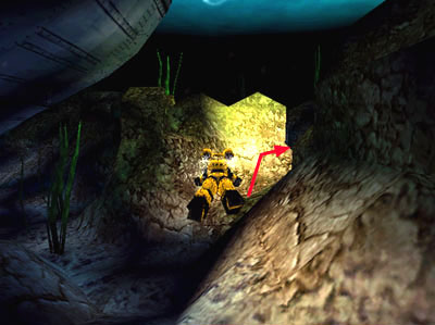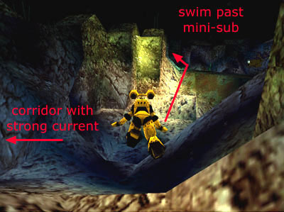 After turning right beyond the seaweed, you'll notice a channel between the rocks on the left. The strong current prevents you from swimming through, though. Continue forward to another open area with a hostile mini-sub.