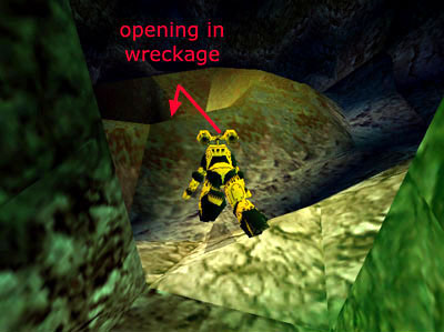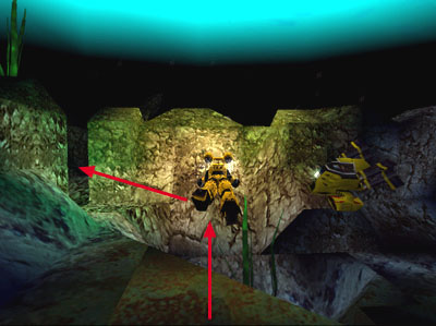 Swim past the sub and into a narrow channel between some blocky green rocks on the far left. Follow this channel. . .