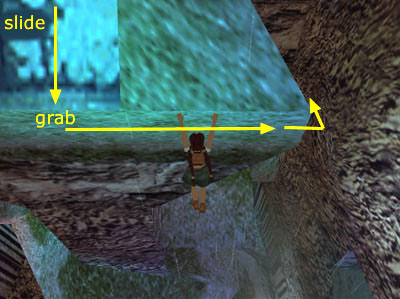 After jumping across the chasm and traversing along the crevice to the ledge around the corner, turn to face the whitewashed slope. Jump to the slope, slide back and grab the edge as you did before.