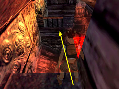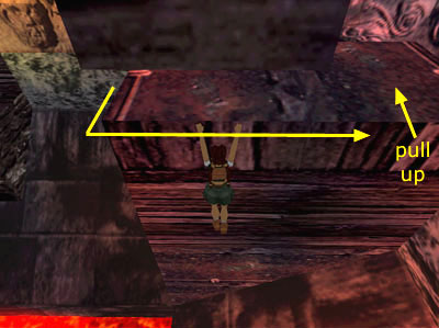 Turn left to face the break in the railing just inside the entrance. From here, take a running jump across the lava pool to grab the ledge in the corner. Don't pull up into the alcove. Instead traverse to the right. . .