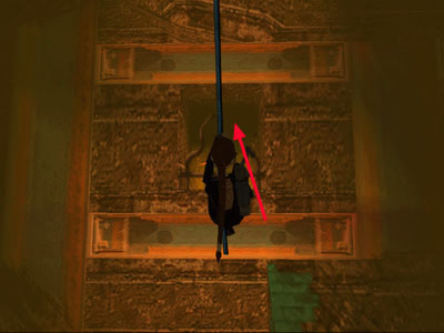 Position Lara on the broken stairs so she's facing the dangling rope squarely. Take a standing jump from the edge of the broken stairs to grab the rope. (Not shown.) Swing toward the opening with the twisted metal bars on the other side of the stairwell. Jump from the rope into the opening. . .