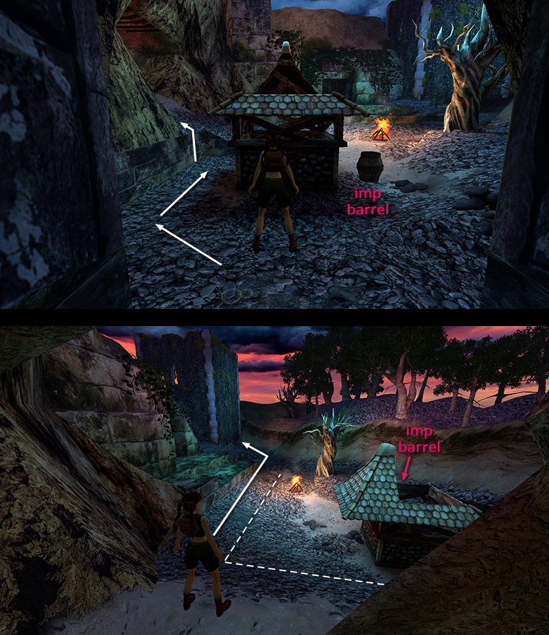 THE GALLOWS TREE AND COVERED WELL: First, be careful not to step too close to the campfire or Lara will catch fire. Also, if she approaches the covered well, she'll trigger the appearance of a changeling (not killed) from inside the barrel. It will follow and attack her, making exploring the area quite a bit more difficult than it has to be. To avoid triggering it, stay on the stone steps or the first row of gray-and-white pebbled tiles below the steps. (The trigger tiles are shown in the section with screenshots.)
