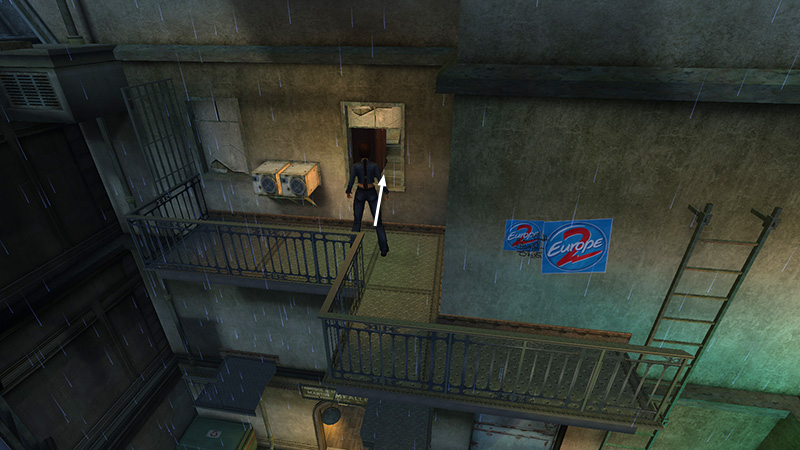 When you have everything, climb back out the window. Climb onto the white HVAC unit next to the window. Face right and jump straight up to grab the edge of the opening overhead. Then press Forward to pull up onto the balcony.