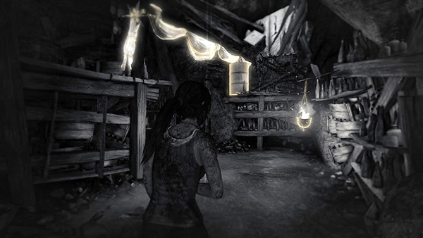 SMALL ROOM WITH DEBRIS AND WOODEN LEDGE: Here the game shows you how to use Survival Instinct. Press the button indicated (Q on the keyboard, L2 on the PS3, L1 on the PS4, LB on the Xbox) to reveal objects in the environment with which Lara can interact. (screenshot) Release the button and continue moving to return to normal view.