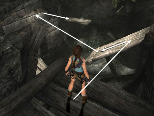 Alternatively, instead of jumping from the top ledge directly to the sloping roof, climb the first of the two vertical wooden poles (i.e., the one protruding from the stone part of the structure). Jump from there to grab the second vertical pole. At this point, Lara should be positioned correctly to make the next jump without changing her angle or height on the pole at all. Move the camera directly behind her and then jump straight forward off the pole to land on the sloping roof. (Lara will lose a tiny bit of health when landing.) Just as she starts to slide, immediately jump again to grab the stone handhold near the corner of the structure.