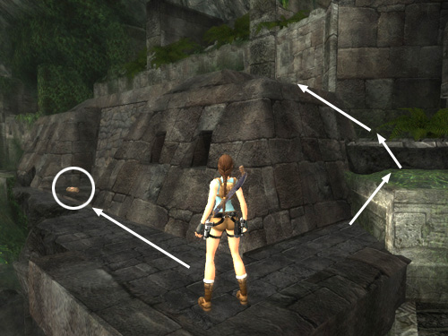 ON TOP OF THE TEMPLE: Vault up onto the darker stone ledge on the right and cross over to the front of the temple to find another small medipack (circled in this screenshot). Return to the doorway where you climbed up from inside. Climb the rocks to the left of the doorway (indicated by arrows in the previous screenshot) onto the roof of the temple and cross over to the other side. Take a running jump to grab the edge of the ledge beyond.