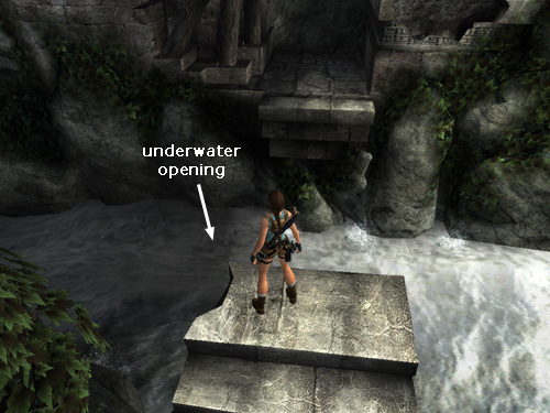 NOTE: I had no trouble just dropping from the ledge with the shotgun and floating downstream, but several players have reported that Lara will drown unless you jump out from the edge on the right side of the opening.