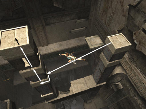 Jump back to grab the lower handhold on the next square pillar. Climb around to the right so Lara is on the side of the pillar out of the path of the flying darts. Jump up three times until she's standing on top of the pillar.