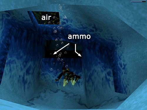 NOTE: If you prefer, you can draw out the fish and then swim away to the opposite end of the passage. Surface in the room with the rats (described below), deal with them, and then shoot the fish from above before going back for the harpoons. Also, if you missed the HARPOON GUN earlier, you'll get it here along with one bundle of harpoons.