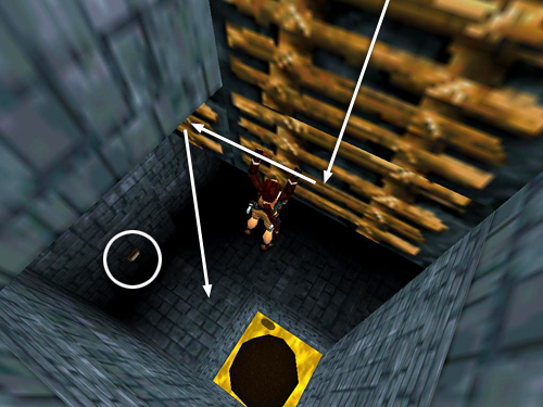 BREAKAWAY TILES AND FUNNEL TO EXIT: At the bottom of the ladder, drop onto the breakaway tiles. Run forward and then make a U-turn around to the left. Keep running and jump at the edge of the tiles to clear the gap and land on the breakaway tile on the other side. Continue forward onto the solid block with the large medi pack (64). (screenshots)