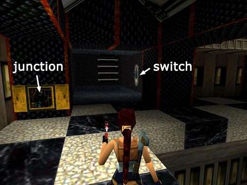 NOTE: There is a ladder at the back of the elevator shaft, which Lara could jump and grab; however, the elevator car above prevents her from climbing all the way to the top of the ladder. So ignore it for now.