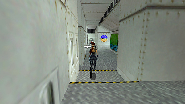 Stand at the edge of the pool with the green boxes behind Lara and jump into the water. The white gate you just opened will be on Lara's right. If you want secret #1, do not go through this gate yet. Once you do, it's impossible to backtrack, so you'll miss the secret. Instead swim straight ahead toward the cage where you entered this area. If necessary get air inside the cage. Then swim up between the cage and the yellow structure. Grab some Uzi clips (13) sitting on the yellow ledge just above the cage door. Turn right and swim along the side of the yellow structure into the square opening at the end of the ledge. Follow the twisty tunnel and pick up 2 bunches of harpoons (14-15) on the way. (screenshots)