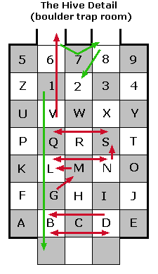 Proceed to the room ahead with the checkerboard floor. There are 25 boulders dangling from the ceiling. The floor is conveniently marked off in squares as well, with five rows of five squares under the boulders and two rows of five without boulders beyond. A long trench filled with lava runs along each side of the checkerboard area, preventing you from straying off the floor. Two of the boulders roll harmlessly off to the sides as you approach. Stepping on various squares causes various boulders to rolland not in a very predictable fashion. You're aiming for the two alcoves on the other side of the boulders. I imagine there are a number of viable ways for getting through this trap. Here's one: