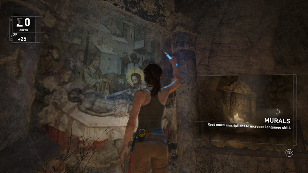 Throughout the game, Lara also increases her proficiency in three languages—Greek, Mongolian, and Russian—by finding and examining Murals, Documents, and Relics. Not all collectibles improve Lara's translation skills, but whenever she has to translate something in the game world, you'll see her proficiency increase incrementally, as indicated by the language skill icon at the top left corner of the screen. When the meter for Greek, Mongolian, or Russian fills, she'll gain a new level in that language. (screenshot)